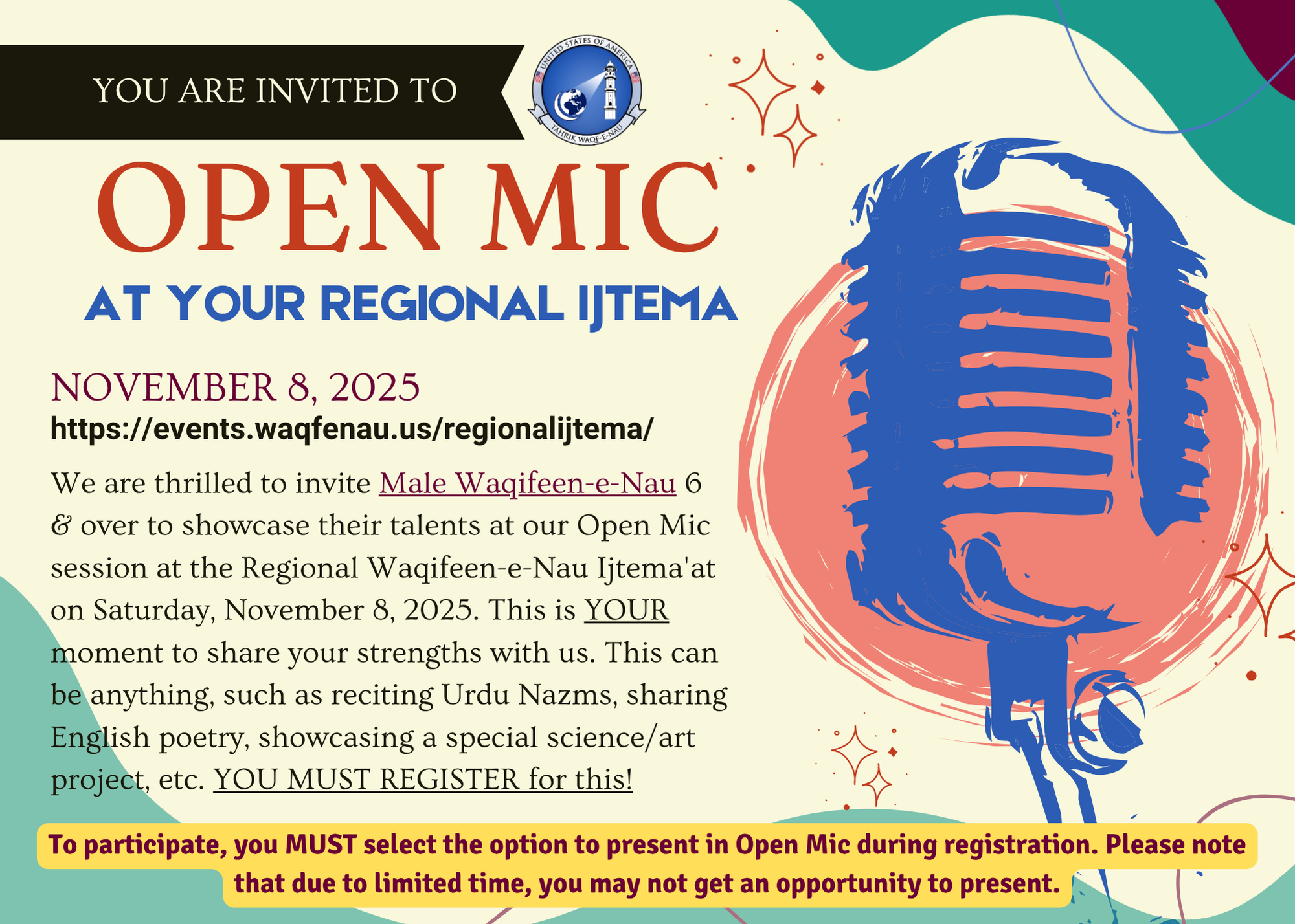 Like the last few years, there will be NO competitions at the Ijtema this year. All Waqifeen-e-Nau between 2 and 21 years old should take part in the Bi-Annual Exams between October 1st and November 5th, 2025. More info at https://www.waqfenau.us/exams/