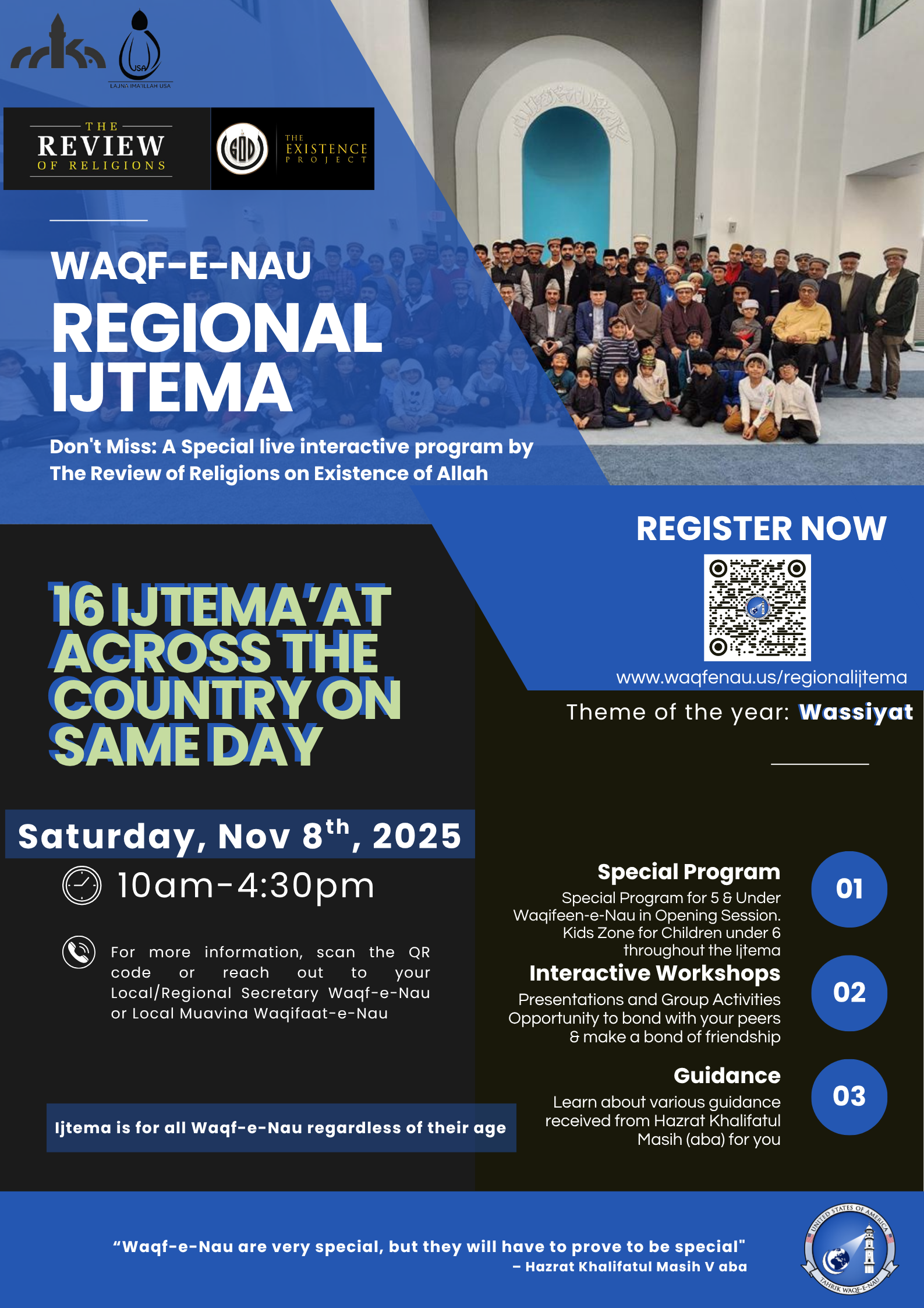 All Waqifeen-e-Nau (2 – 16 years old) who passed with at least 75% in their Spring Exams (April-May) will, inshallah, be recognized at their respective Regional Ijtema.Interactive Workshops, Presentations and Group Activities